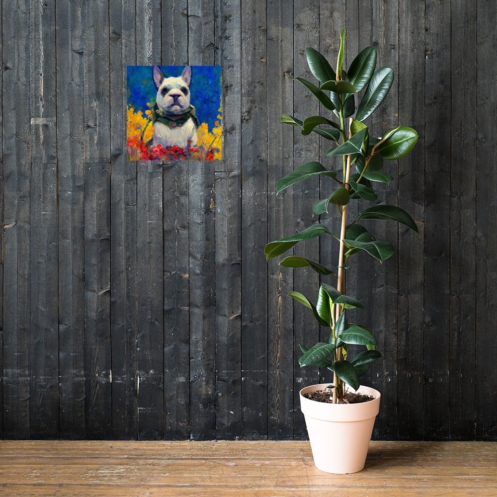 This poster is a museum-quality print that captures a French Bulldog in the style of Claude Monet. The print is made on thick and durable matte paper, and is a great way to honour your favourite breed of dog. The poster is 16″ x 16″ (40.5cm x 40.5cm).
