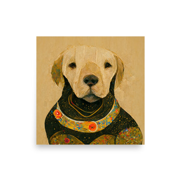 This poster is a museum-quality print that captures a Labrador in the style of Guztav Klimt. The print is made on thick and durable matte paper, and is a great way to honour your favourite breed of dog. The poster is 16″ x 16″ (40.5cm x 40.5cm).